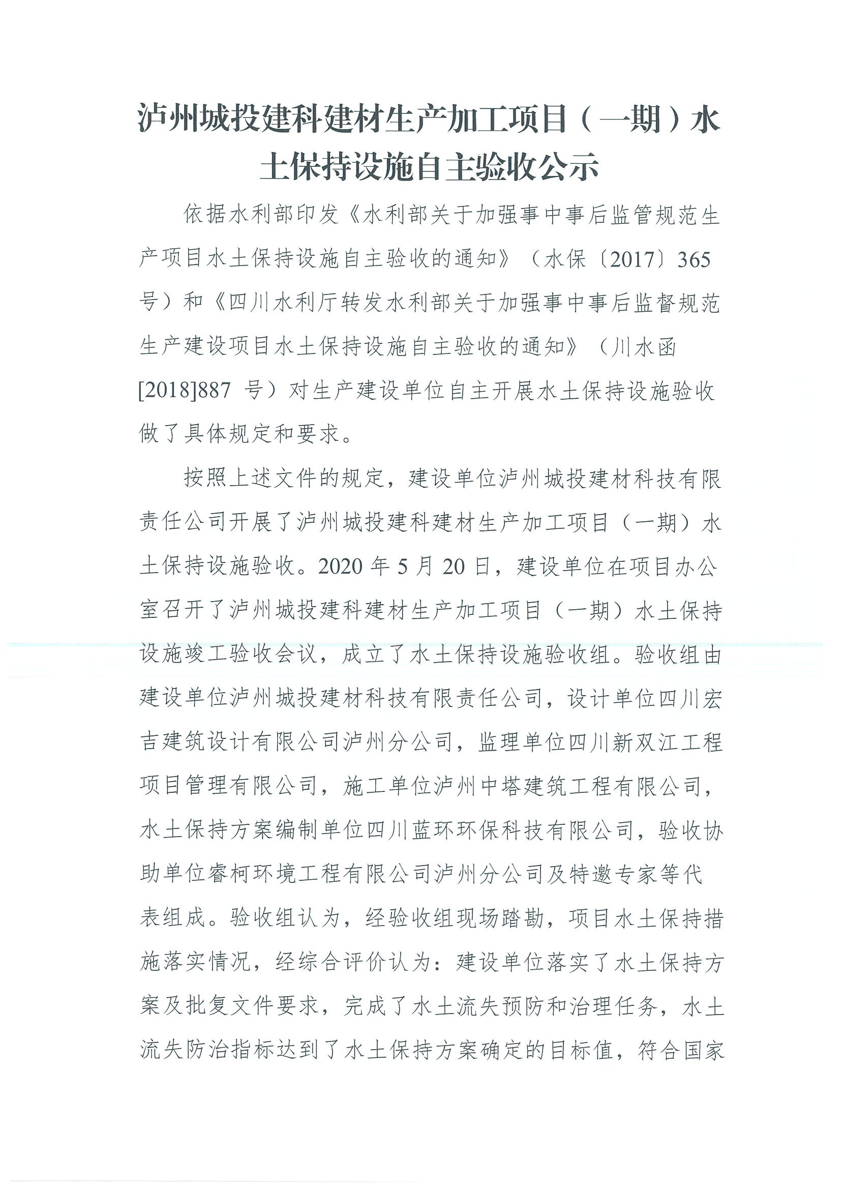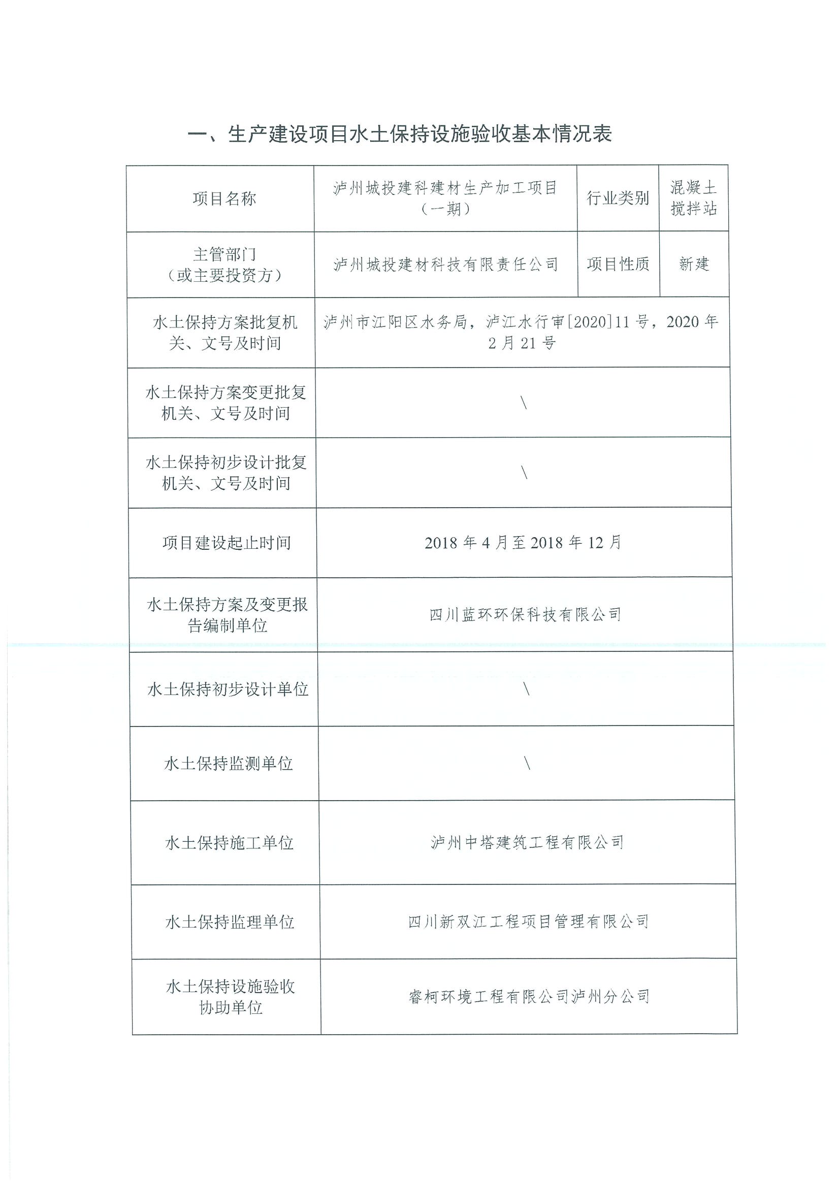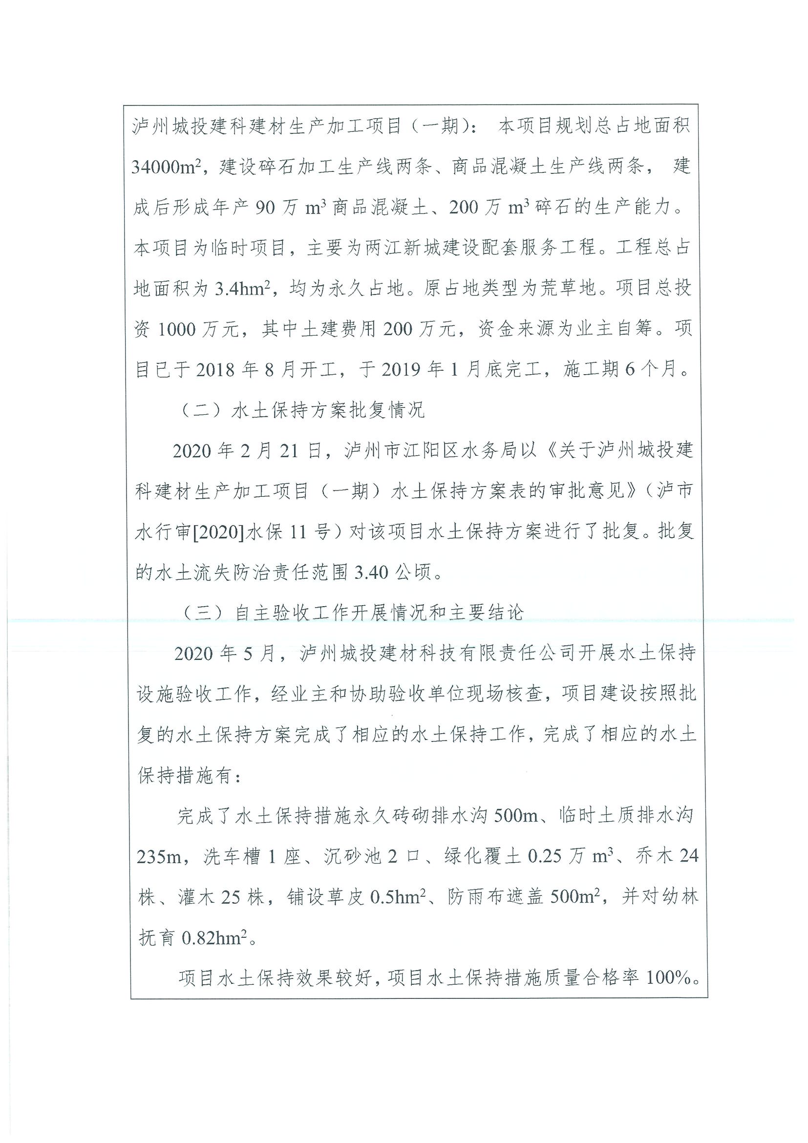 瀘州城投建科建材生產(chǎn)加工項(xiàng)目(一期)水土保持設(shè)施自主驗(yàn)收公示