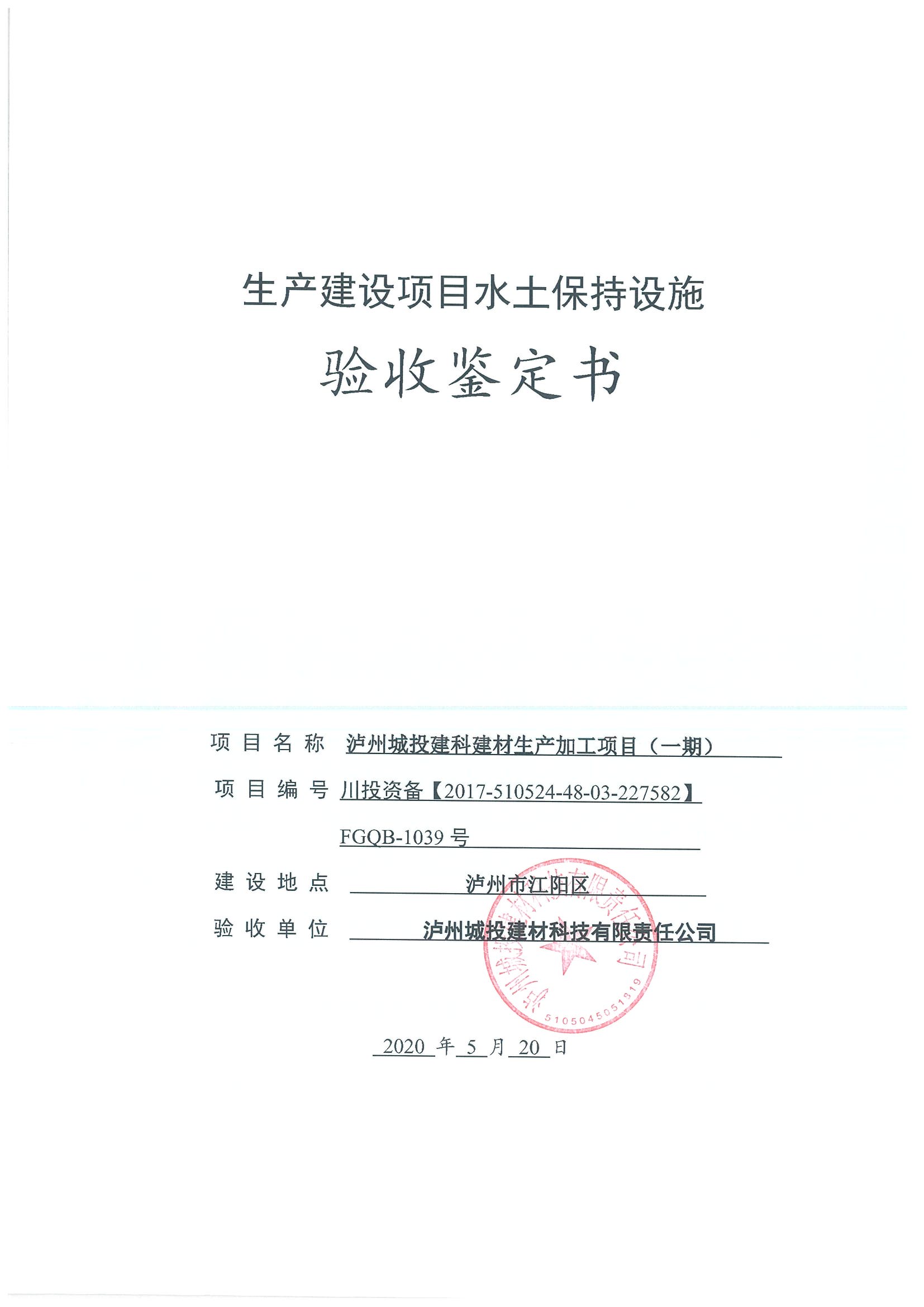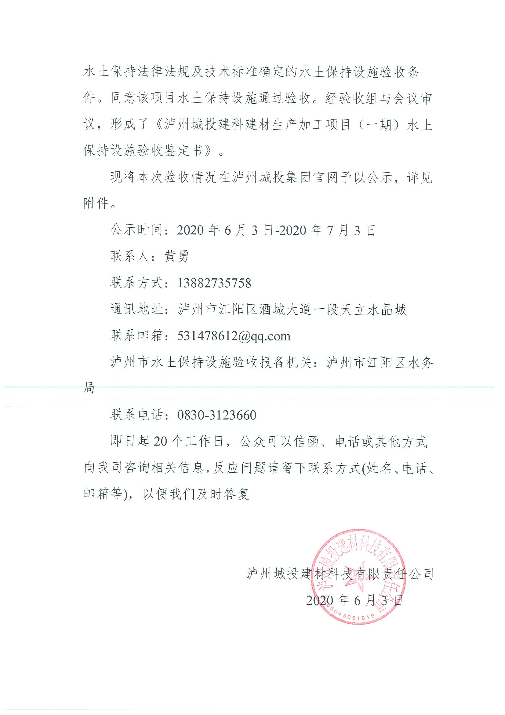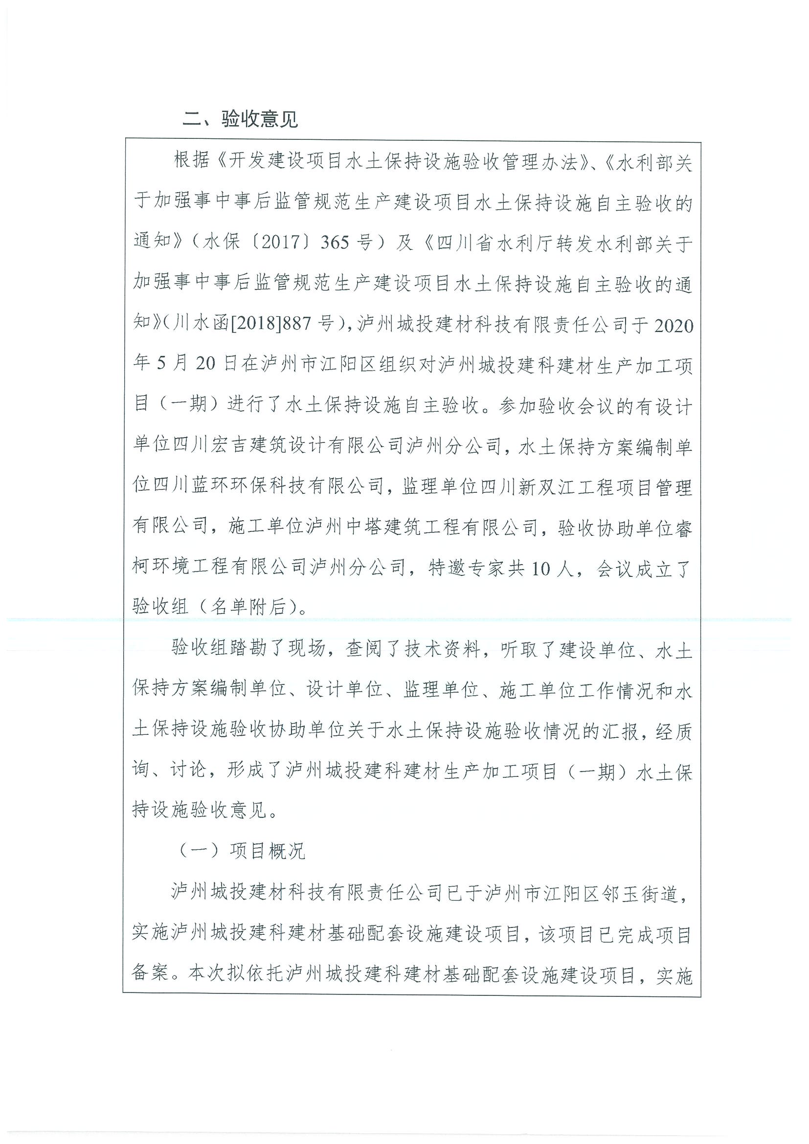 瀘州城投建科建材生產(chǎn)加工項(xiàng)目(一期)水土保持設(shè)施自主驗(yàn)收公示