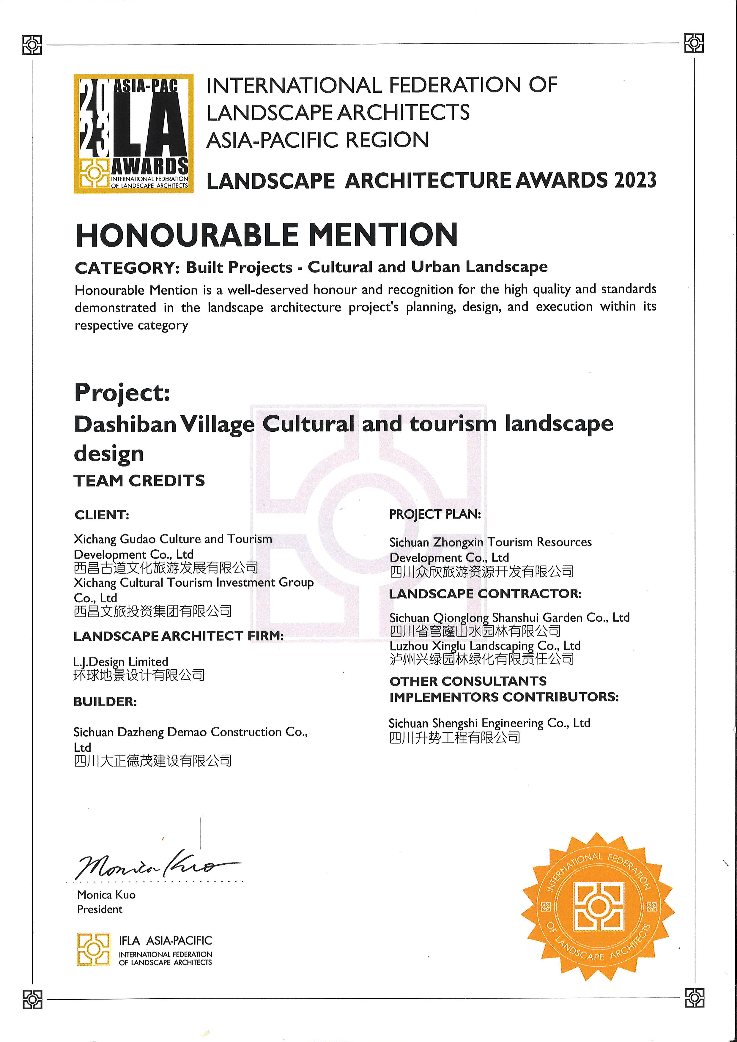 喜訊!瀘州城投集團興綠園林公司榮獲2023IFLA(國際風(fēng)景園林師聯(lián)合會)景觀建筑榮譽獎