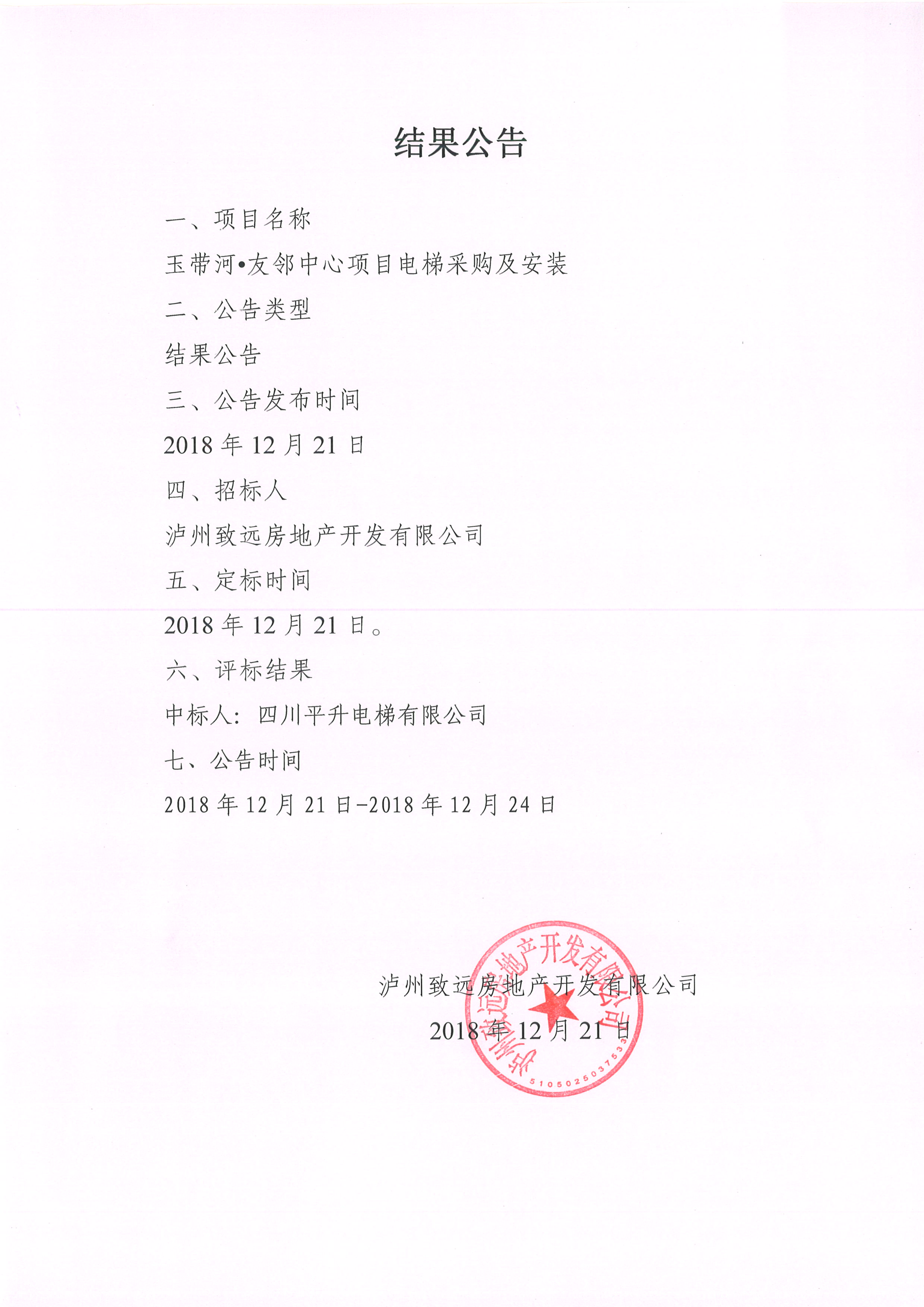 致遠(yuǎn)公司關(guān)于玉帶河·友鄰中心項(xiàng)目電梯采購及安裝結(jié)果公告