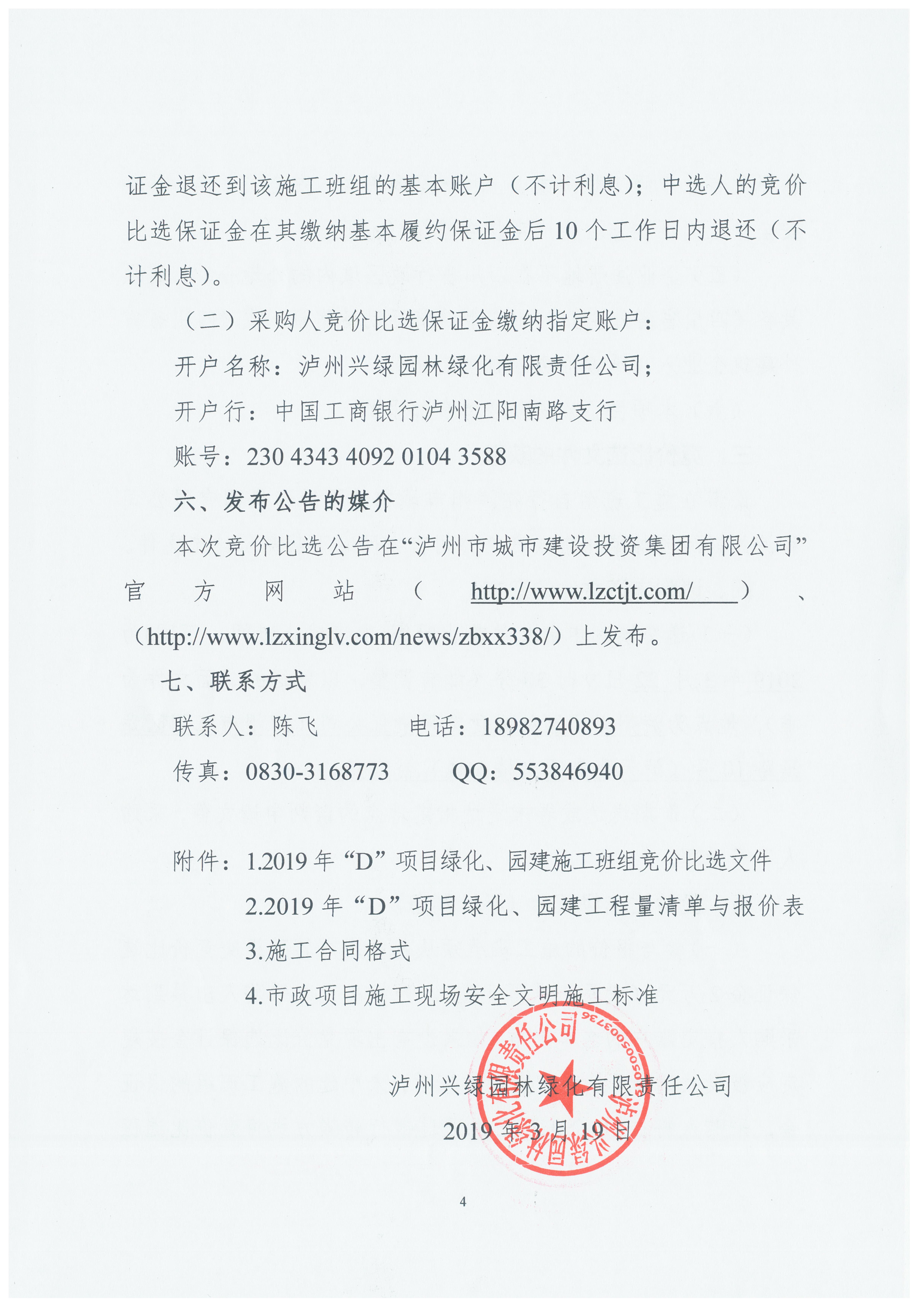附件:1.2019年“D”項目綠化、園建施工班組競價比選文件 2.2019年“D”項目綠化、園建工程量清單與報價表 3.施工合同格式 4.市政項目施工現(xiàn)場安全文明施工標準