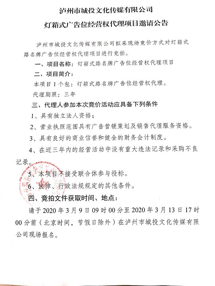 燈箱式廣告位經(jīng)營權代理項目邀請公告