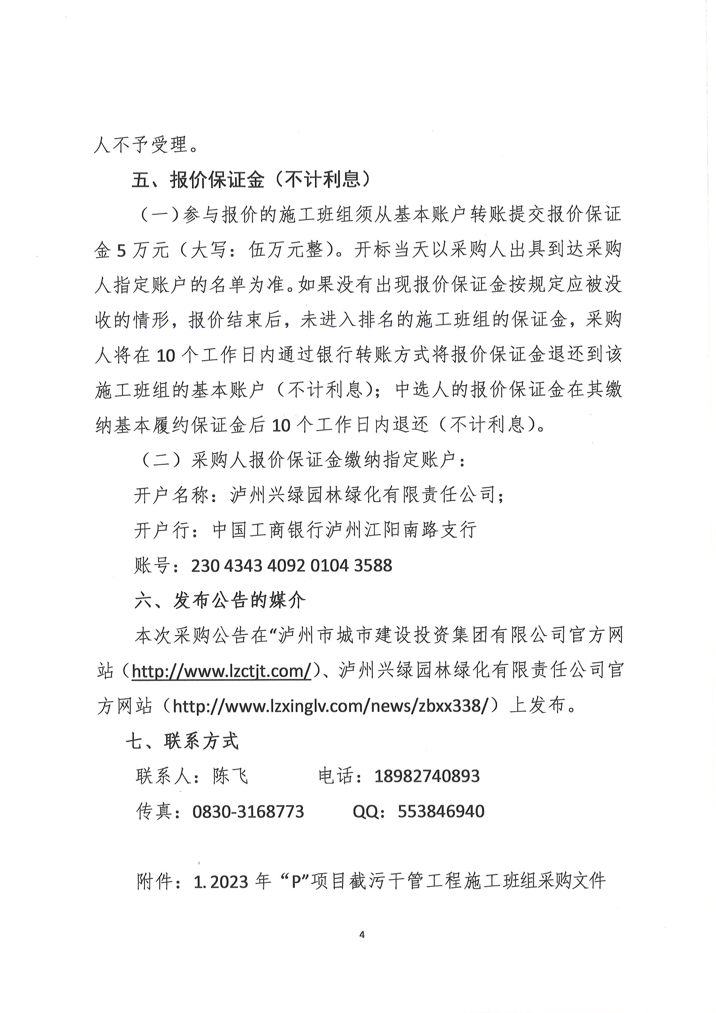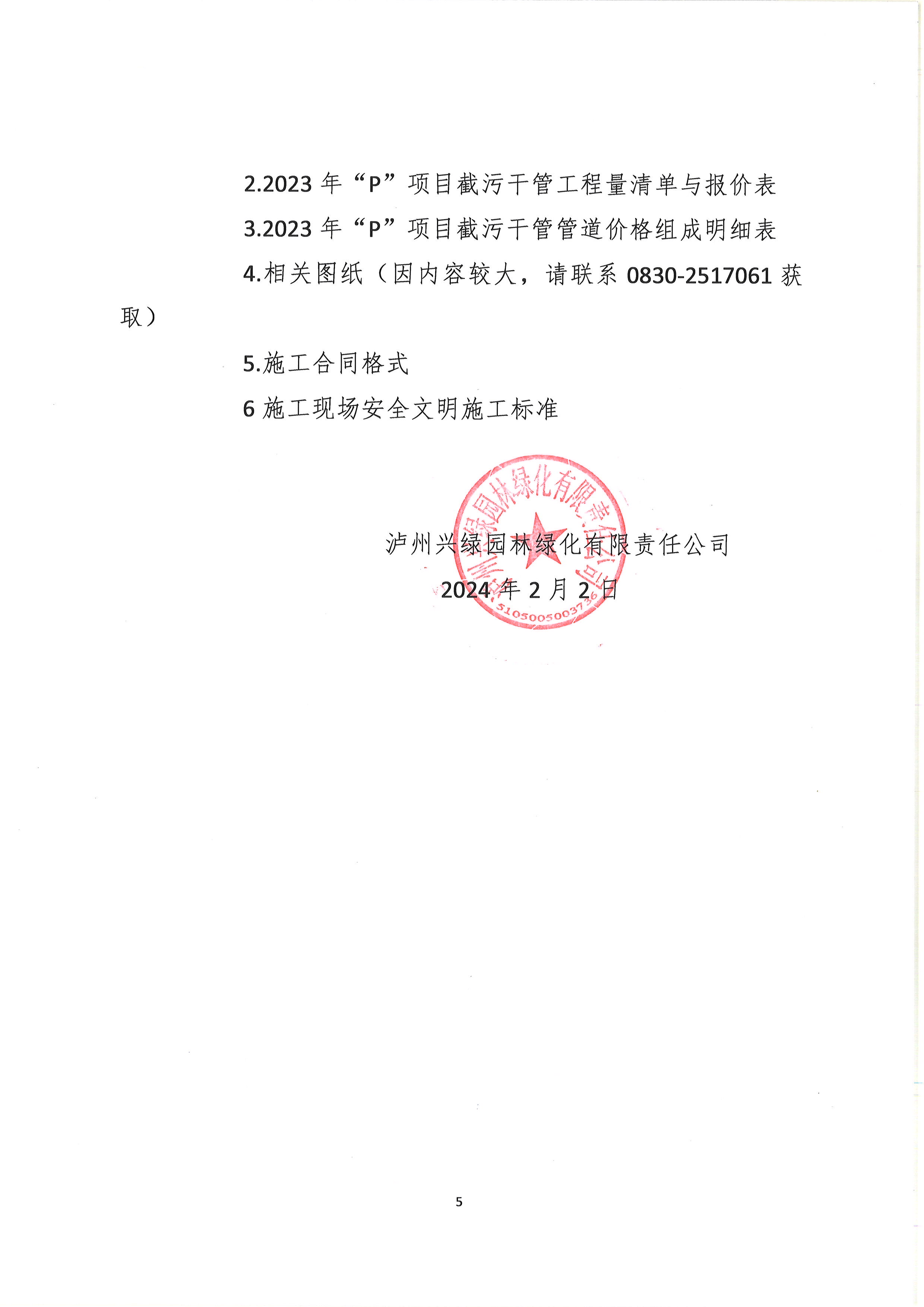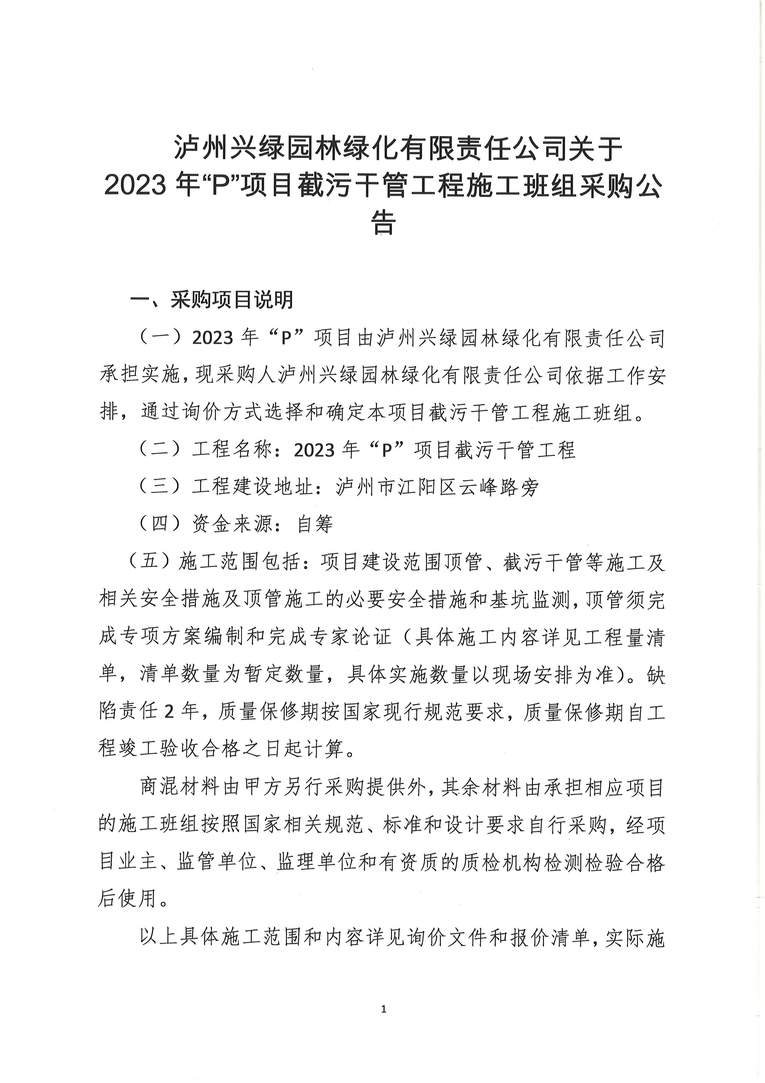 瀘州興綠園林綠化有限責(zé)任公司2023年“P”項目截污干管工程采購公告
